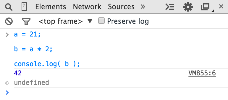 First, the log( b ) part is referred to as a function call (see “Functions”). What’s happening is we’re handing the b variable to that function, which asks it to take the value of b and print it to the console.
