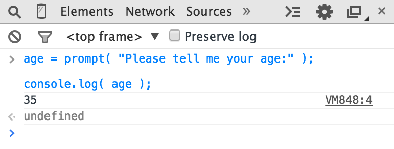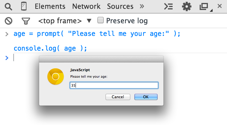 Once you submit the input text by clicking “OK,” you’ll observe that the value you typed is stored in the age variable, which we then output with console.log(..):